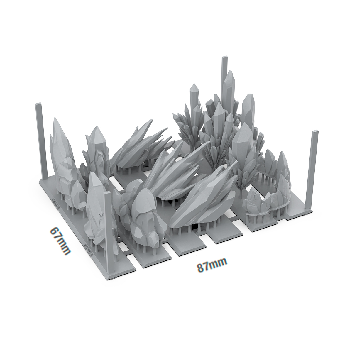 3D-gedruckte Kristall- und Eiseffekte aus Resin zur Darstellung von Frost, Magie und gefrorenen Landschaften. Die Formen zeigen scharfkantige Kristallstrukturen und vereiste Oberflächen, die eine klare, kalte Ästhetik erzeugen.