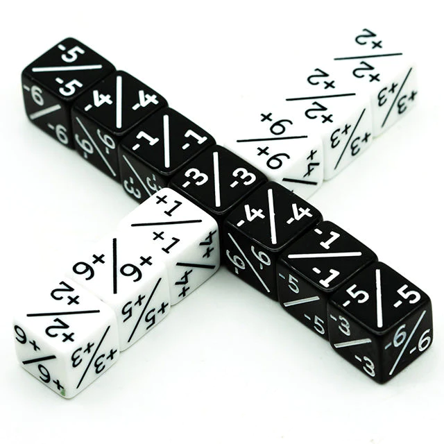 12-teiliges RPG Würfelset mit 6 schwarzen und 6 weißen Counter-Würfeln Opaque. Die Würfel zeigen Werte von -1 bis -6 und von +1 bis +6.