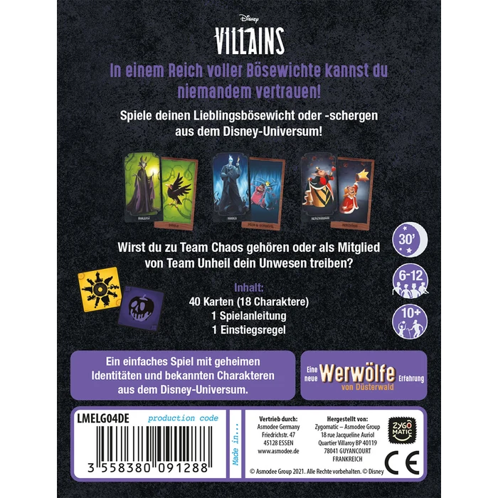 Ähnlich wie in „Werwölfe von Düsterwald“ treten in „Disney Villains – Versammlung des Bösens“ zwei Teams gegeneinander an, mit dem Ziel sich gegenseitig auf die Schliche zu kommen bzw. genau dies zu verhindern. Doch sind es hier nicht Menschen gegen Werwölfe, sondern die legendären Disney Bösewichte und ihre Schergen, aufgeteilt auf Team Unheil und Team Chaos.