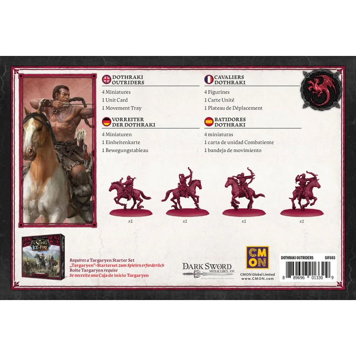 Die Erweiterung Dothraki Outriders für das A Song of Ice and Fire: Tabletop Miniaturenspiel gibt den Spielern des Hauses Targaryen eine schnelle Fernkampftruppe für ihre Armee. Diese leicht gepanzerten, berittenen Truppen setzen auf die Stärke von ihren Pferden, bevor und nachdem sie Pfeile auf ihre Gegner niederregnen lassen. Mit ihrer großen Geschwindigkeit können die Dothraki Outriders Feinde erreichen und ihnen Schaden zufügen, die normalerweise in den hinteren Reihen einer Armee in Sicherheit sind. Feindliche Befehlshaber werden es schwer haben, diese hochmobilen Truppen in Schach zu halten.