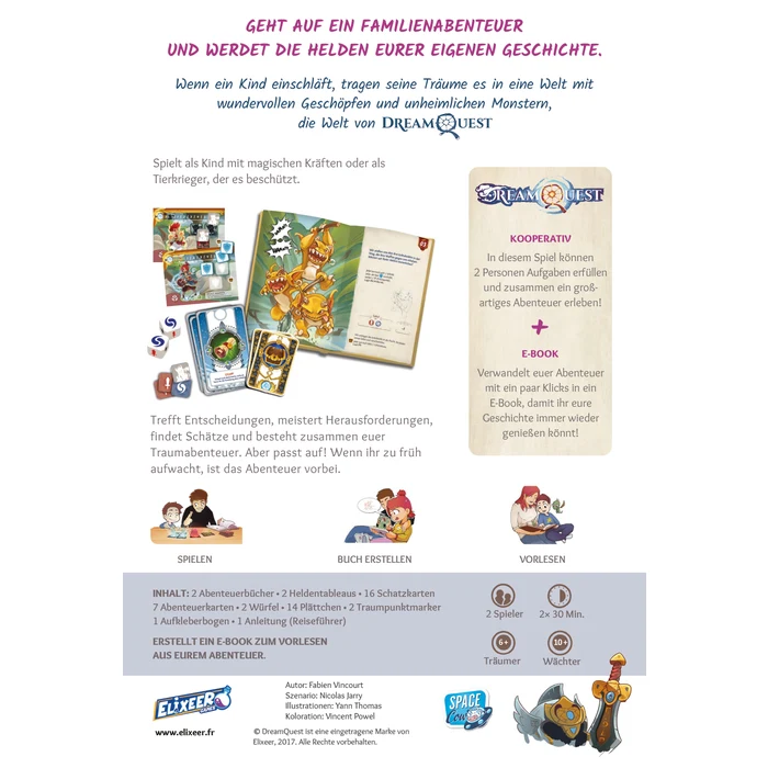 DreamQuest ist ein kooperatives Eltern-Kind-Abenteuer, das ihr gemeinsam erlebt. Dabei schlüpft ihr in die Rolle von zwei Helden. Die Träumerin ist ein Kind mit magischen Kräften. Der Wächter ist ein mächtiger Tiermensch, der die Träumerin auf ihrer Reise beschützt. Das Besondere an DreamQuest ist, dass ihr beim Spielen euer eigenes Buch schreibt, das ihr danach immer wieder lesen könnt.
