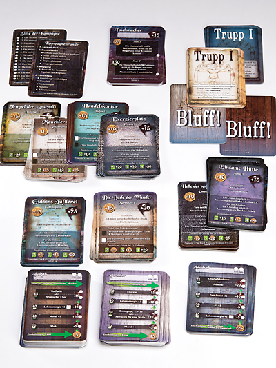 Die Kampagnenkarten enthalten alle für eine Kampagne benötigten Spielkarten. Es sind besondere Plätze, Örtlichkeiten und Bauwerke von Longfall enthalten, um die ihr euch kloppen werdet. Die Karrierekarten ermöglichen euch einen rasanten Aufstieg mit vielen Verbesserungen eurer Charaktere. Die Berater können angeheuert werden um eurer Mannschaft den entscheidenden Vorteil zu bringen. Mit den Truppkarten und Bluffs kundschaftet ihr die Gebiete aus, und die Übersichten erleichtern euer Kampagnenleben.