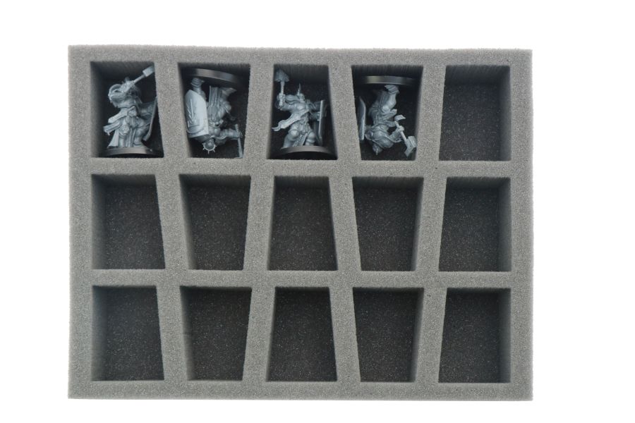 - Einen weichen Schaumstoff-Einsatz für 15 Miniaturen mit rautenförmigen Fächern (30/40mm x 54mm x 40mm), speziell für Miniaturen auf 40mm-Basen;
