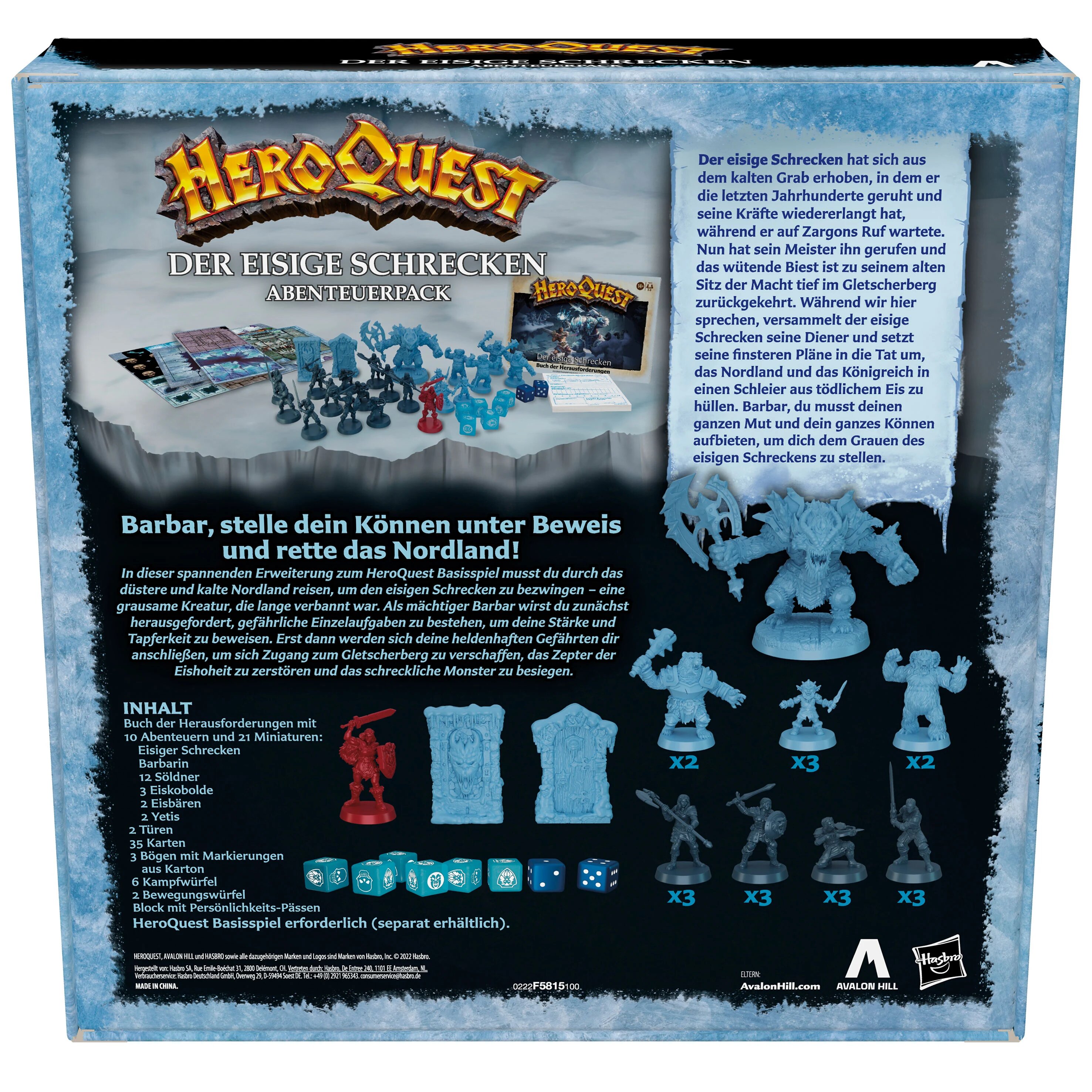 Das Abenteuer rund um HeroQuest geht weiter und lässt die Spieler noch tiefer in die Welt des beeindruckenden Fantasy-Spiels eintauchen. Bei der Erweiterung Der eisige Schrecken müssen die Spieler den eisigen Schrecken bezwingen − eine grausame Kreatur, die lange verbannt war, nun aber an ihren alten Sitz der Macht zurückgekehrt ist und auf Zargons Ruf wartet. Der mächtige Barbar beziehungsweise die Barbarin muss gefährliche Einzelaufgaben überstehen, denn nur dann werden sich andere Heroen anschließen.
