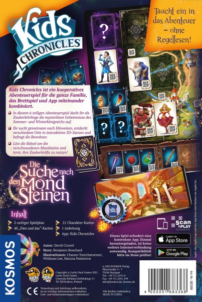 Wo sind bloß die vier Mondsteine? In diesem kooperativen Abenteuerspiel mit App-Anbindung schlüpfen 1-4 Kinder ab 7 Jahren in die Rolle von Zauberlehrlingen auf der Suche nach den verlorenen Mondsteinen. Auf dem Weg zum Ziel warten in sechs Kapiteln viele Rätsel und Aufgaben. Mithilfe der App und dem Brettspiel bewegen sich die Kinder in der magischen Welt, sammeln Gegenstände und erkunden Orte. Die Orte und Charaktere im Spiel werden durch das Scannen von QR-Codes auf dem Spielplan und den Karten interaktiv erlebbar. Gemeinsam geht es in diesem Familienspiel mit dem Tablet oder Smartphone auf virtuelle Spurensuche. Die perfekte Kombination aus Brettspiel und App in einem!