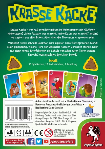 Na sowas! Da hat eines der Tiere doch glatt ein Häufchen in der Küche hinterlassen. Aber natürlich war es nicht mein Hamster, sondern der Papagei vom Nachbarn. Oder vielleicht doch eher die Schildkröte? In Krasse Kacke müssen die Spielenden möglichst schnell den Verdacht von ihren eigenen sechs Haustieren ablenken und die der anderen beschuldigen. Wer die Unschuld aller seiner Tiere beweisen konnte, ist fein raus. Wer übrig bleibt muss hingegen die Hinterlassenschaften wegräumen.