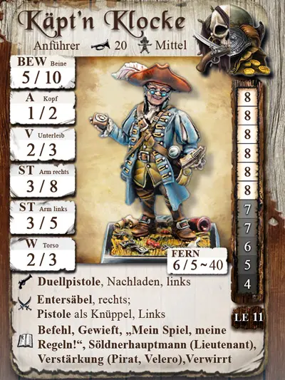 Käpt'n Klocke ist ein Söldner, der für alle Mannschaften außer für die Amazonen kämpft. Ja, er kann auch von den Schatten in einer speziellen Variante angeheuert werden - ich sag euch: da tun sich Abgründe auf!