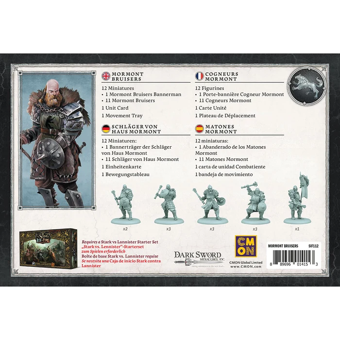 Die Einheiten-Erweiterung A Song of Ice & Fire – Mormont Bruisers (Schläger von Haus Mormont) bietet Spielern von Haus Stark eine brutale Nahkampfeinheit für ihre Truppen. Zugunsten purer Angriffskraft, die sogar während der Verteidigung durchscheint, verzichtet diese Einheit auf schwere Rüstungen und Schilde. Ihre leichten Schilde sind mit einem Schlagdorn versehen, was sie sogar dann gefährlich macht, wenn sie in die Defensive gedrängt werden. Gegnerische Einheiten sollten auf der Hut vor misslungenen Attacken sein, wenn sie den Schlägern von Haus Mormont nachsetzen.