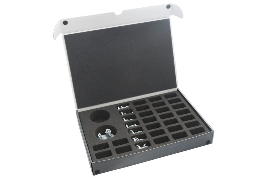 Die Box enthält ein Schaumstofftablett mit 32 Schlitzen der Größe 52mmx28 und 32mm tief für Trooper-Minis und 2 runde Schlitze mit einem Durchmesser von 72mm und 45mm tief.