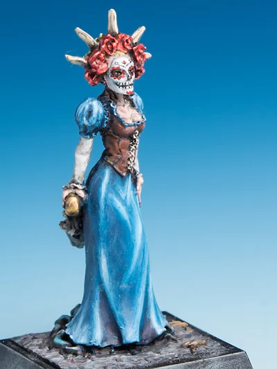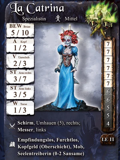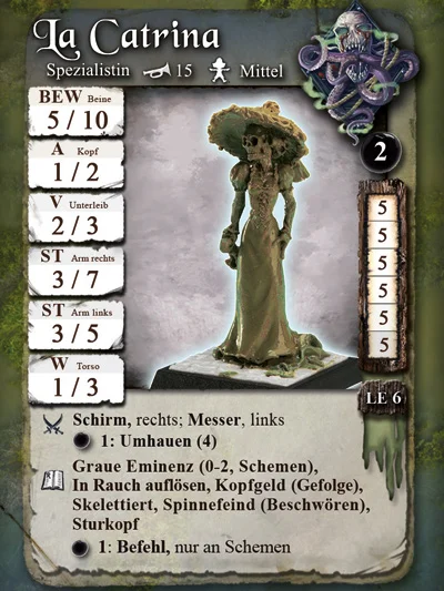 La Catrina ist eine Spezialistin für den Kult und für die Schatten. Der Figur liegt ein zweiter Kopf bei, um entweder die Variante für den Kult oder die der Schatten bauen zu können.
