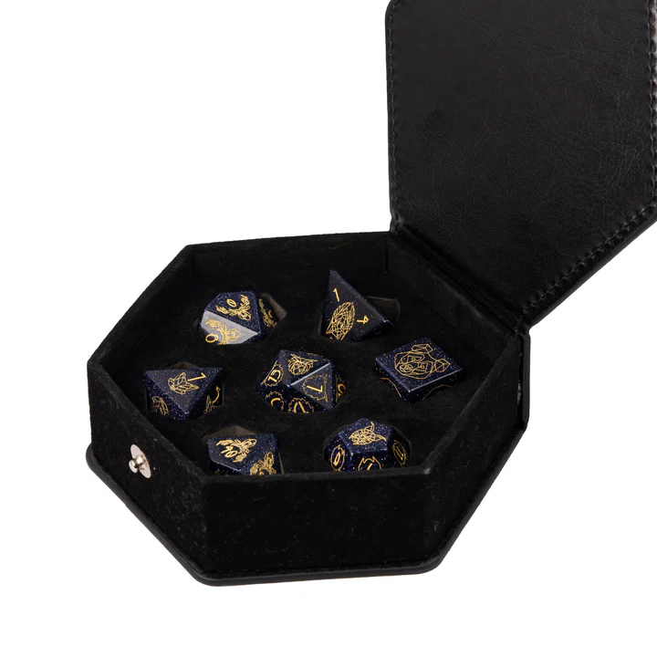 Jedes Set wird mit einem hochwertigen World of Dice Kunstleder-Etui geliefert, das deine Würfel sicher und stilgerecht aufbewahrt.