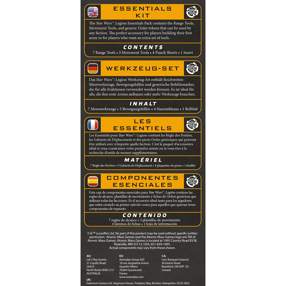 Das Werkzeug-Set für Star Wars™: Legion ist die ideale Ergänzung für dein Spiel. Es enthält 7 Messwerkzeuge, 3 Bewegungshilfen, 4 Marker-Stanztableaus sowie ein Beiblatt – alles, was du brauchst, um deine Schlachten übersichtlich und flüssig zu gestalten.