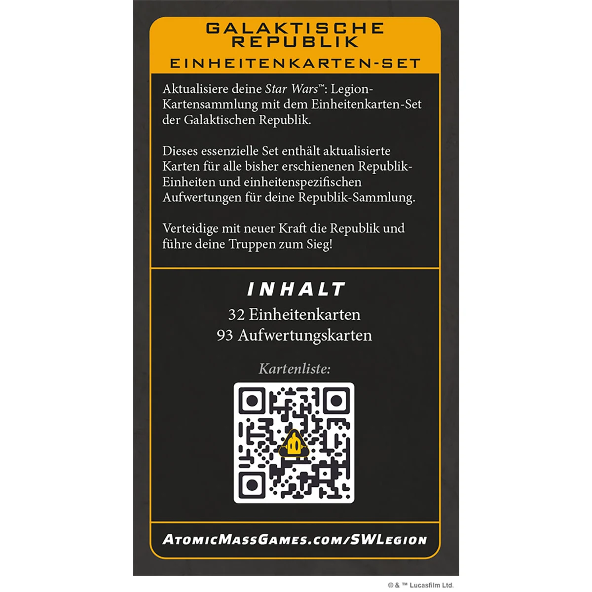 Aktualisiere deine Star Wars™: Legion-Sammlung mit diesem Kartenpaket für die Galaktische Republik. Das Set enthält 32 Einheitenkarten und 93 Aufwertungskarten für alle bisher erschienenen Republik-Einheiten, neu gestaltet im aktuellen Layout und angepasst an die neuesten Regeln.