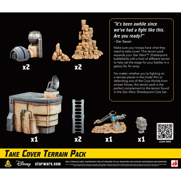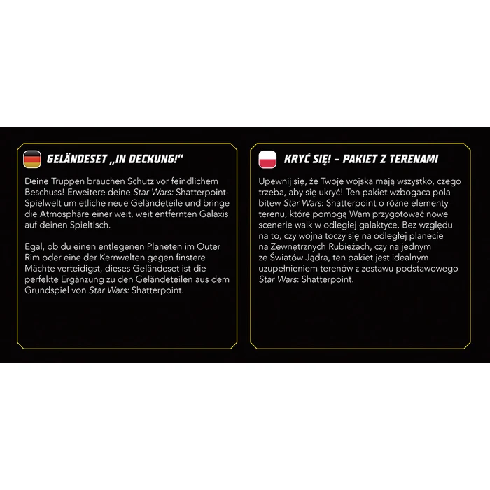 Geländeteile sind ein essenzieller Bestandteil der Star Wars™: Shatterpoint-Spielwelt. Das Geländeset „In Deckung!“ ist mit Geländeteilen wie einem Swoop-Bike die perfekte Ergänzung zu den Geländeteilen aus dem Grundspiel, egal, ob ein entlegener Planet im Outer Rim oder eine der Kernwelten gegen finstere Mächte verteidigt werden müssen.