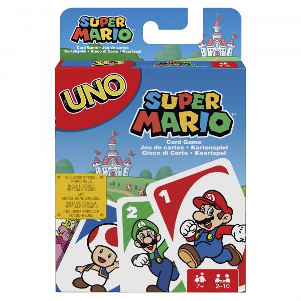 Mario, Luigi und all ihre Freunde sind jetzt Teil eines besonderen UNO Kartenspiels! Es ist das allseits beliebte UNO, doch diese Version enthält noch eine besondere Mario Block-Karte, mit der ein Charakter unbesiegbar wird! Nachdem ein anderer Spieler/eine andere Spielerin eine „Zieh 2“-Karte oder eine „Zieh 4“-Karte ausgespielt hat, darf die Strafe mithilfe der Block-Karte abgeblockt und auf den anderen Spieler/die andere Spielerin zurückgeworfen werden, sodass dieser/diese 2 oder 4 Karten ziehen muss! Wer zuerst alle Karten abgelegt hat, erhält die Punkte. Der erste Spieler/die erste Spielerin oder das erste Team mit 500 Punkten gewinnt. Ganz wichtig: Wer nur noch eine Karte auf der Hand hat, muss „UNO!“ rufen.