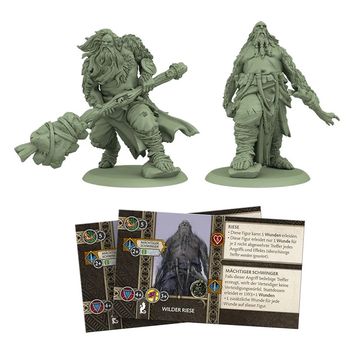 Im südlichen Westeros sind Riesen nichts weiter als ein Mythos, mit dem man Kindern in Gutenachtgeschichten einen Schrecken einjagen will. Aber weit im Norden, jenseits der Mauer, sind die Wilden Riesen sehr real. Als Verbündete des Freien Volkes sind sie wandelnde Belagerungsmaschinen und sind in der Lage, auch einen schwer gerüsteten Mann in Stücke zu reißen, wobei ihnen selbst nur die verheerendsten Treffer etwas ausmachen können. Ein einziger Riese in einer Armee des Freien Volkes kann eine Einheit nach der anderen in Grund und Boden stampfen und alles und jeden zermalmen und zerquetschen, der töricht genug ist, sich in seinen Weg zu stellen.