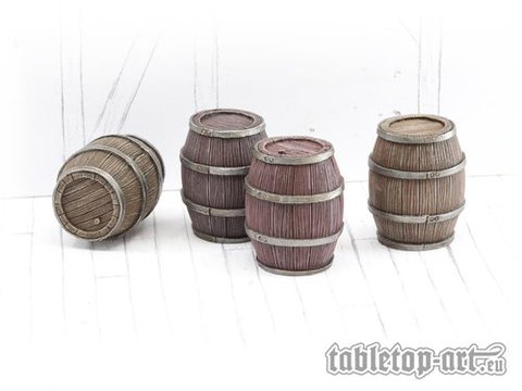 Das Set beinhaltet 4x Holzfässer gefertigt aus Resin. Die Fässer haben eine höhe von ca. 26mm. Maßstab: 28-30mm
